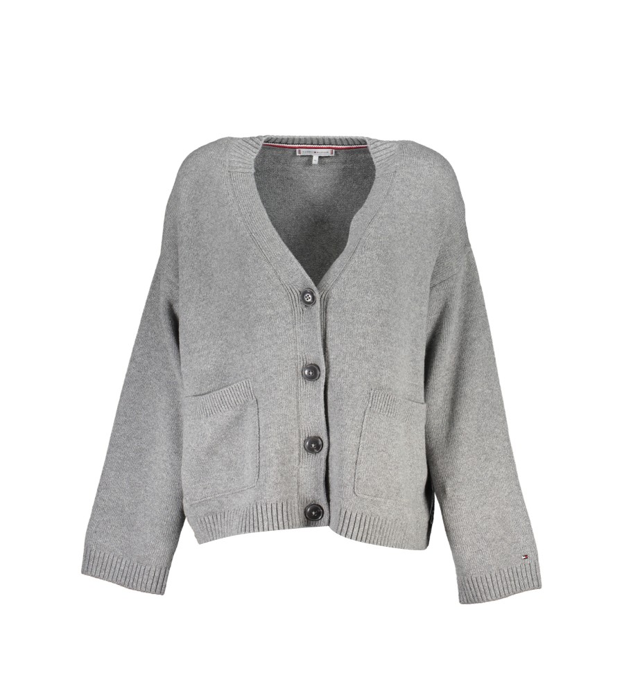 KARDIGANAS ILGOMIS RANKOVĖMIS, V formos iškirptė, 4 mygtukai, PRAŠYMAS, logotipas