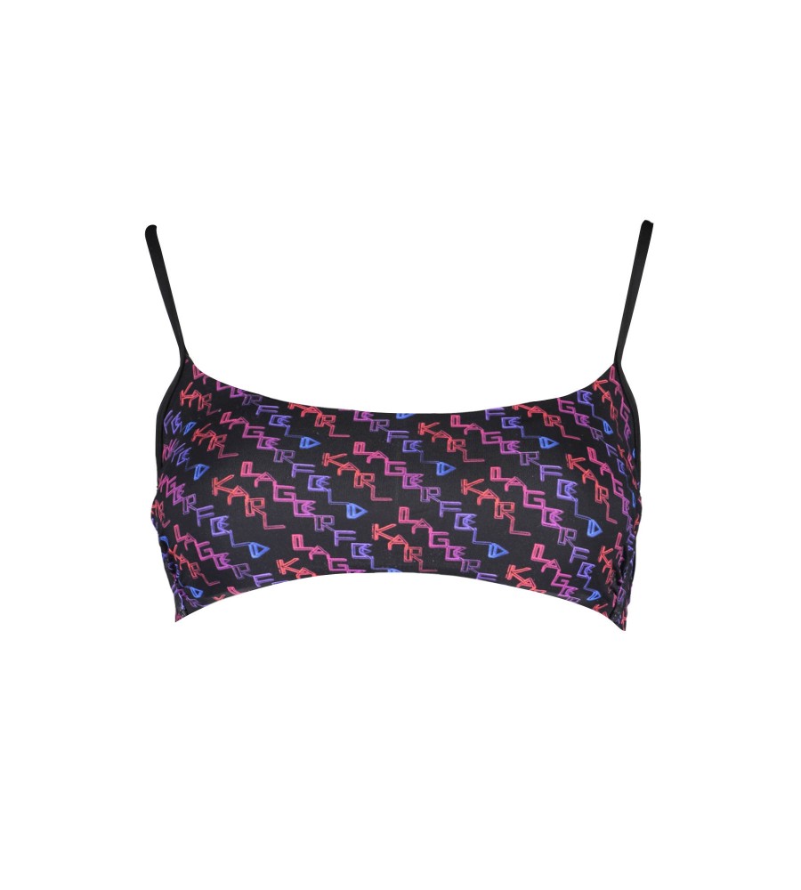 bandeau maudymosi kostiumėlis, pamušalu vidus, nuimamas paminkštinimas, raišteliai ties kaklu, užsegimas, kontrastingos detalės, logotipas