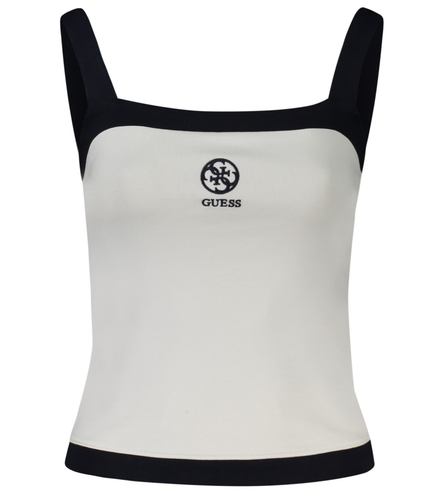 Tanko viršus, platūs dirželiai, kontrastingos detalės, siuvinėjimas, logotipas, ekologiška medvilnė