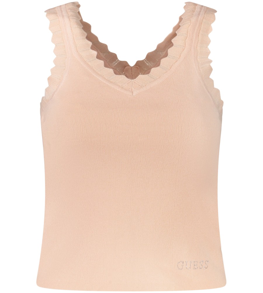 Megztas rezervuaro viršus, platūs dirželiai, V formos kaklas, „Rhinestone“ programa, logotipas