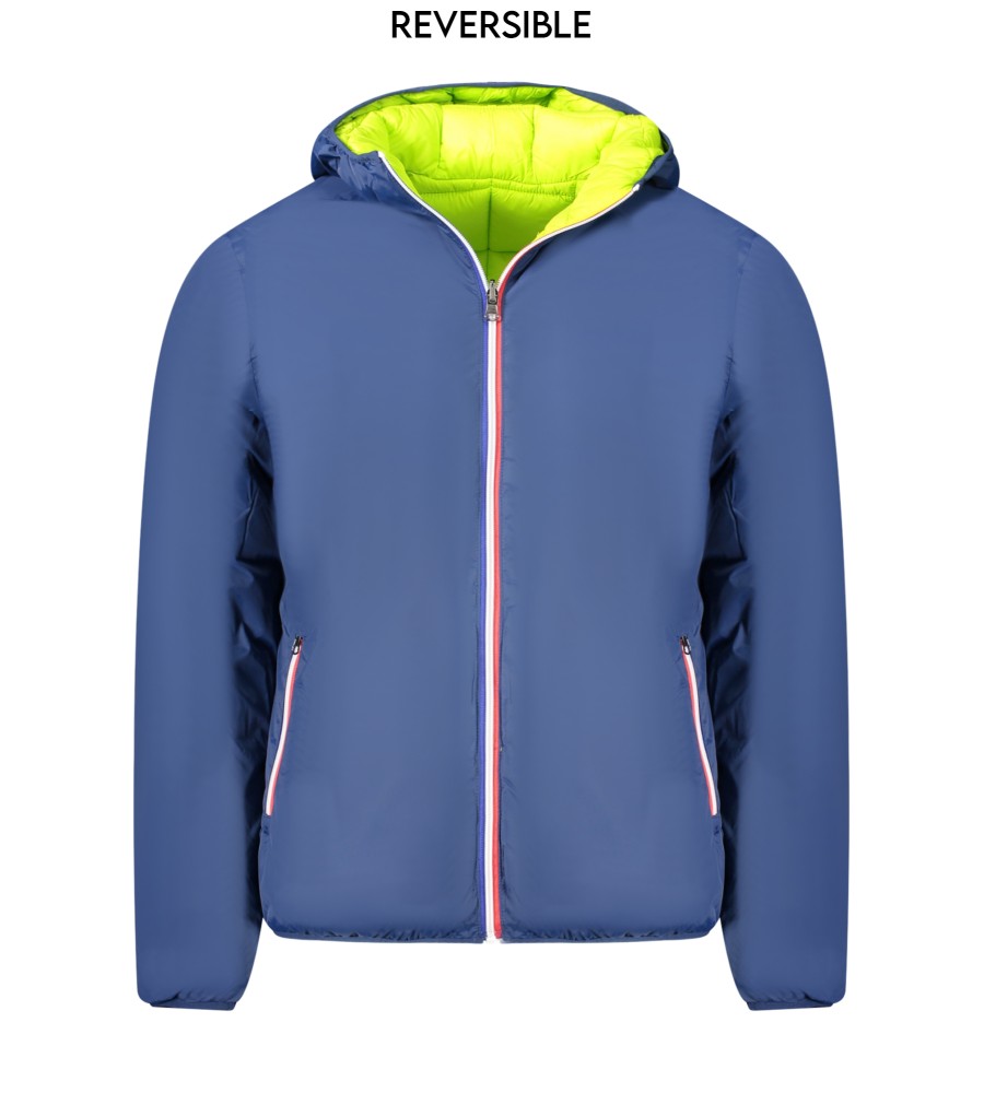 Striukė ilgomis rankovėmis su gaubtu, grįžtama mėlyna/fluorescencinė žalia, 2 išorinės kišenės, 2 vidinės kišenės, ZIP, taikymas, logotipas