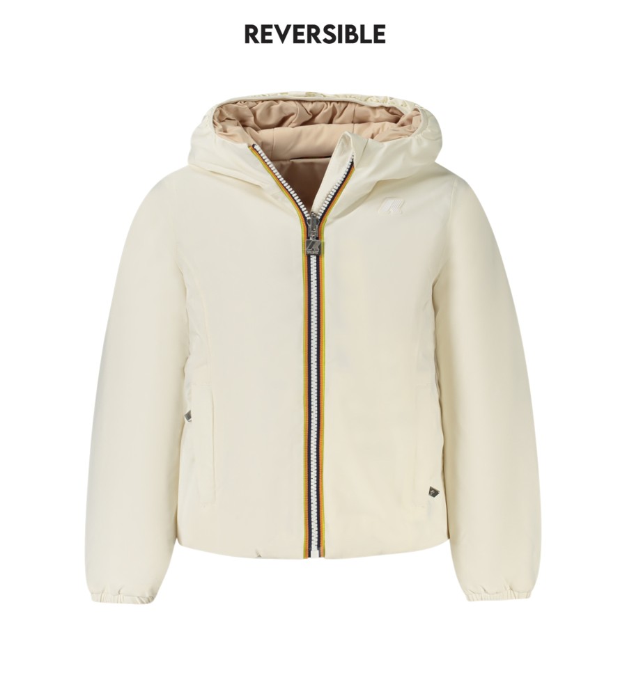 Striukė ilgomis rankovėmis su gaubtu, grįžtama balta/smėlio spalvos, paminkštinta, 2 išorinės kišenės, 2 vidinės kišenės, kontrastingos detalės, taikymas, ZIP, logotipas