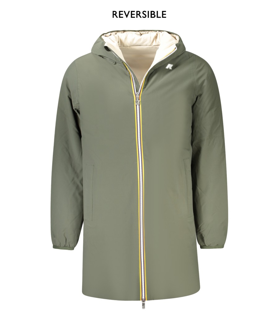 Ilga striukė su ilgomis rankovėmis ir gaubtu, grįžtama žalia/smėlio spalvos, paminkštinta, 2 išorinės kišenės, 2 vidinės kišenės, kontrastingos detalės, ZIP, taikymas, logotipas