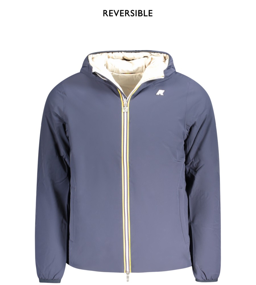 Šiltai šildoma švarkas su gaubtu, grįžtama mėlyna/smėlio spalvos, 2 išorinės kišenės, 2 vidinės kišenės, kontrastingos detalės, ZIP, taikymas, logotipas, logotipas