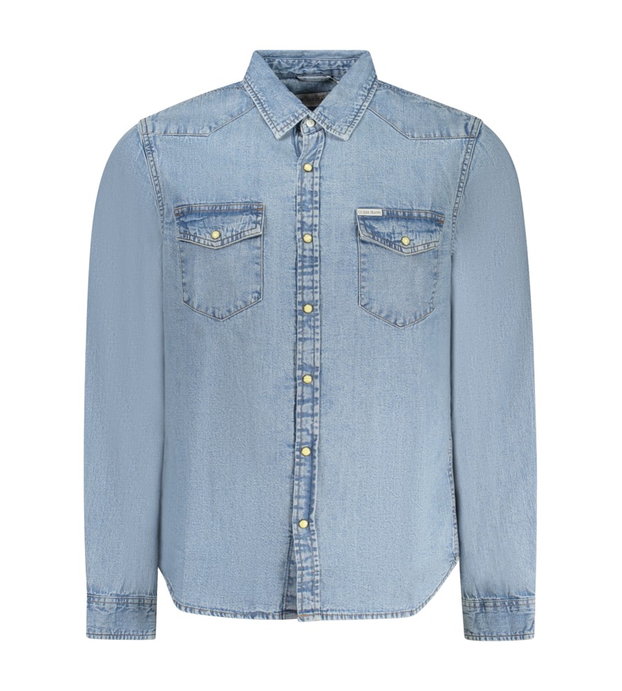 Džinsiniai marškinėliai ilgomis rankovėmis, liekna, itališka apykaklė, 1 mygtuko rankogaliai, 2 kišenės, automatinis, logotipas