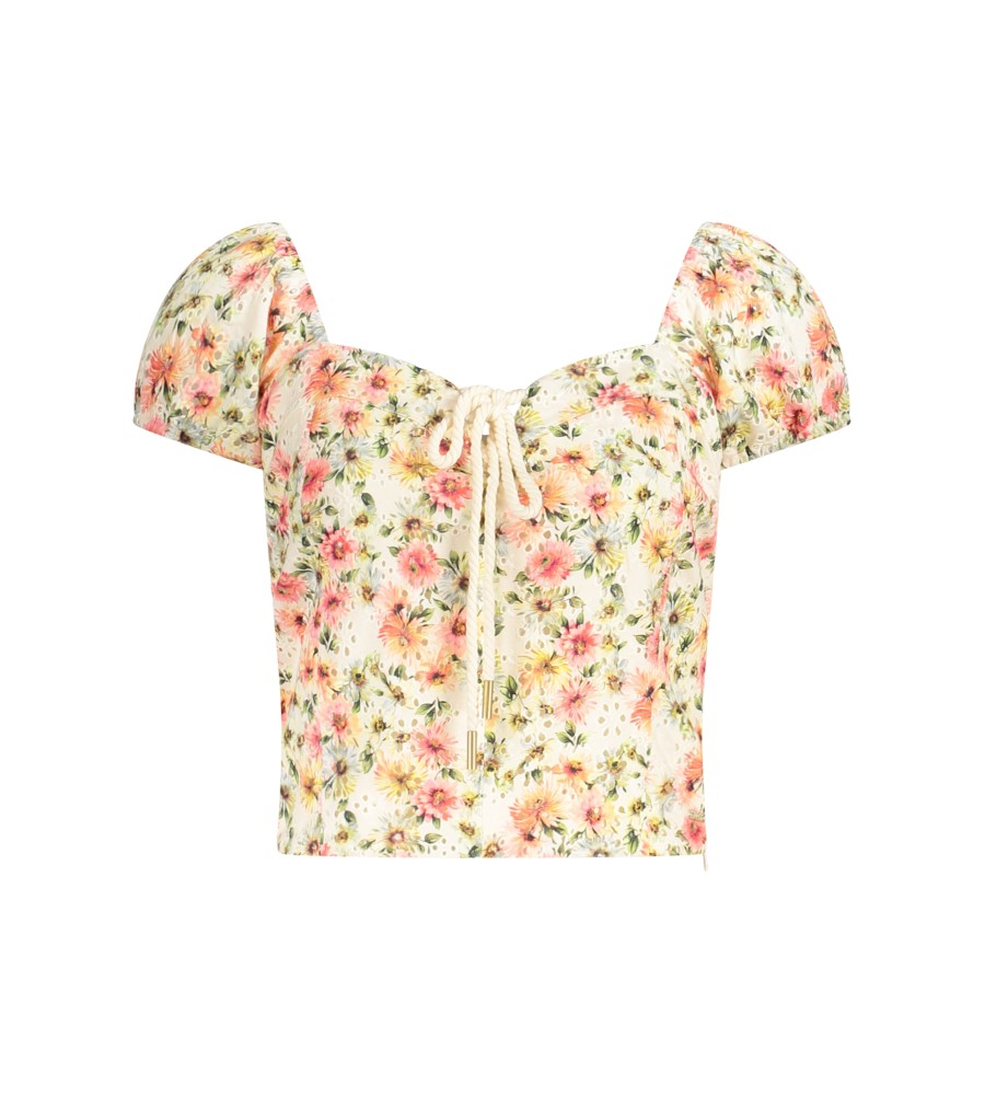 Cisternos viršus su plačiais dirželiais ir gėlėmis, saldi iškirptė su raišteliais, šoniniu užtrauktuku, logotipu, ekologiška medvilne