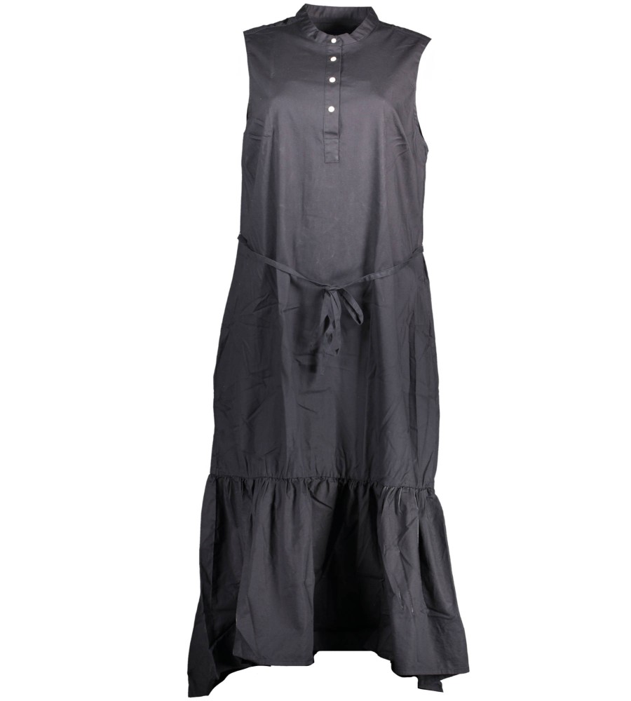 ilga suknelė, be rankovių, apvalus kaklas su sagomis, 2 kišenės, juosmens diržas, logotipas, ekologiška medvilnė