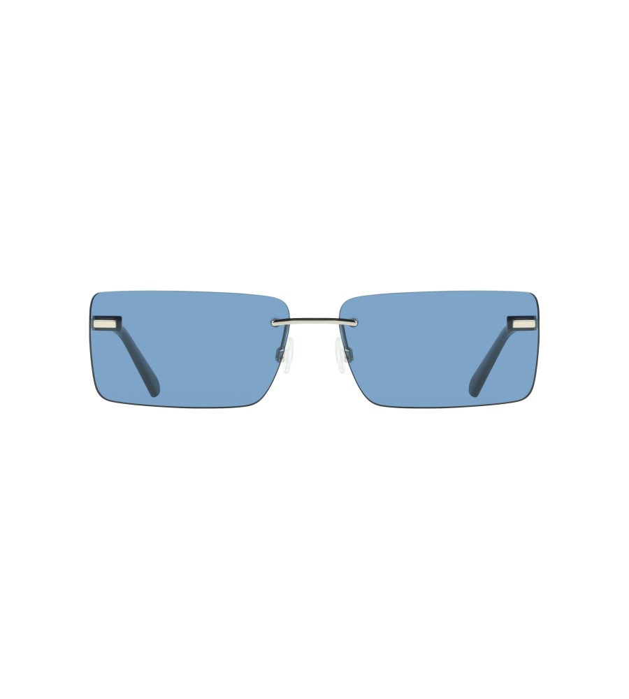 Akiniai nuo saulės, metalinis rėmas, stačiakampis objektyvas, mėlynas objektyvas, objektyvo plotis 61 mm, tilto plotis 16 mm, šventyklos ilgis 145 mm, kontrastingos detalės, logotipas
