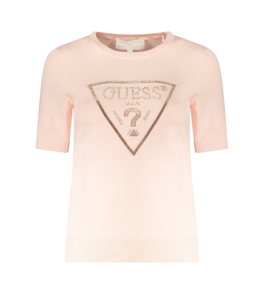 Megztinis trumpas rankoves, įgulos kaklas, kontrastingos detalės, programos, rhinestone, logotipas