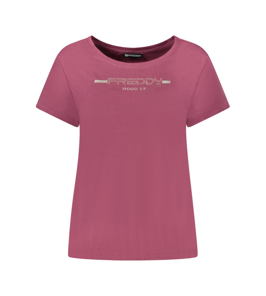 Marškinėliai trumpomis rankovėmis, plačia iškirptė, „Rhinestone“ programa, spausdinimas, logotipas
