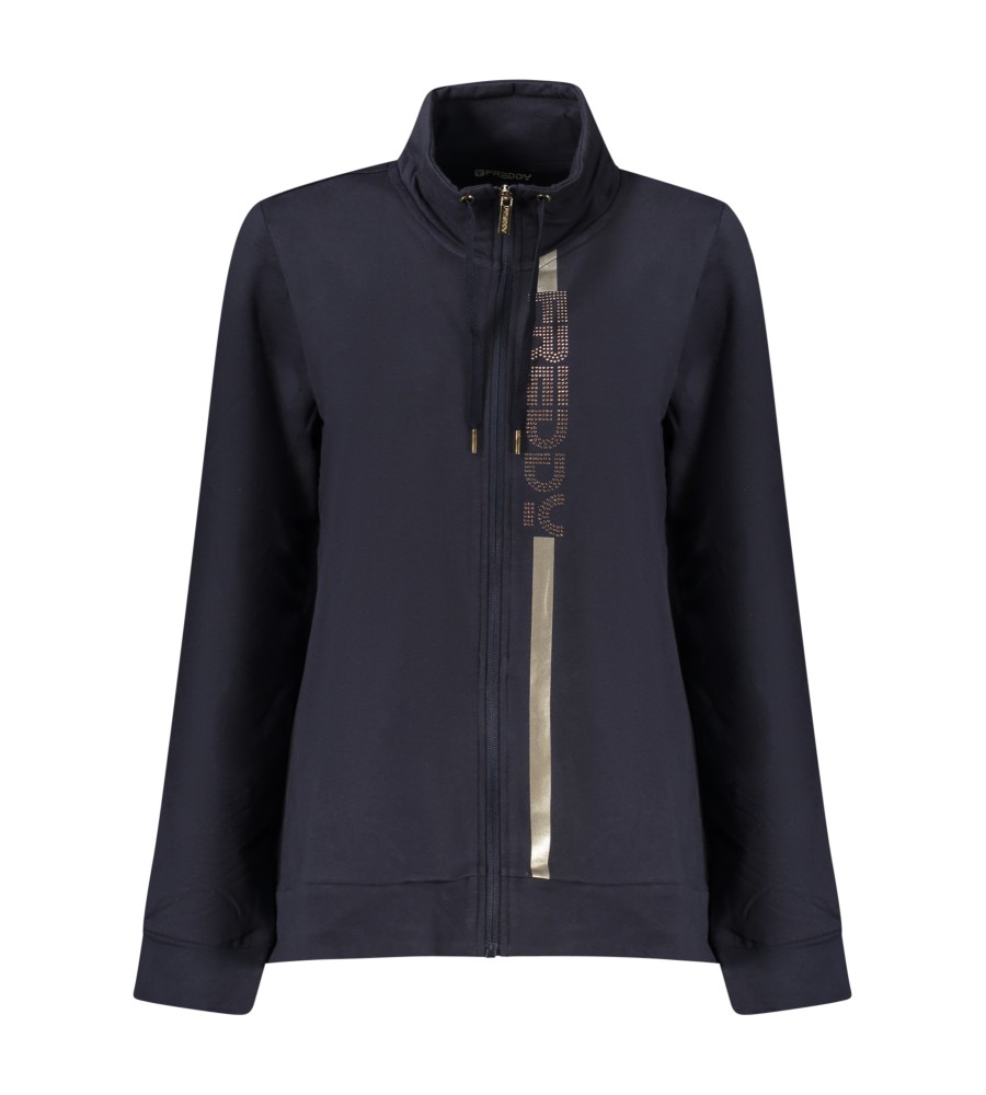 Megztinis ilgomis rankovėmis, megztinis, 2 kišenės, užtrauktukas, „Rhinestone“ programa, logotipas