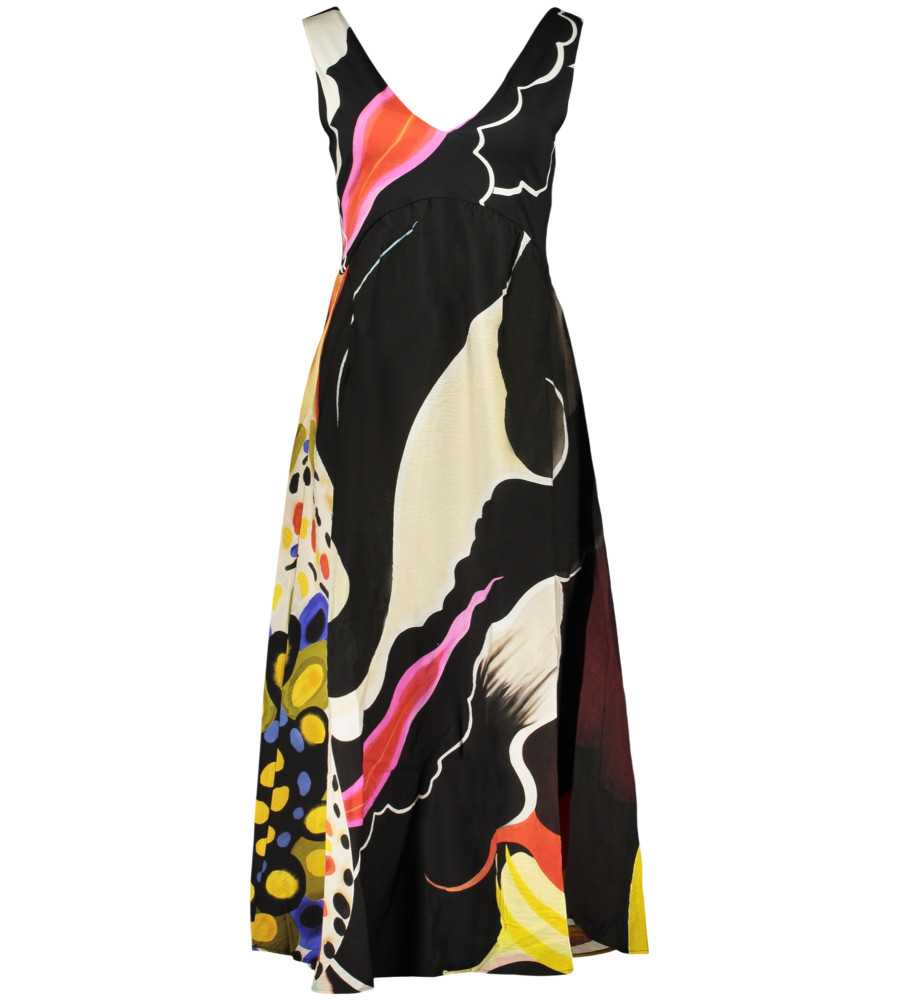 ILGA RAŠTA SUKNELĖ, JAPAN OPART LACROIX, PLAČIOS petnešėlės, V formos iškirptė, spauda, ​​logotipas